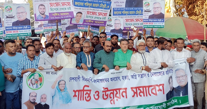 সারাদেশে বিএনপি জামায়াতের অবরোধ, অগ্নিসন্ত্রাস, হত্যা ও নৈরাজ্যের প্রতিবাদে সিলেটের বিশ্বনাথে মিছিল এবং শান্তি ও উন্নয়ন সমাবেশ করেছে উপজেলা আওয়ামী লীগ।