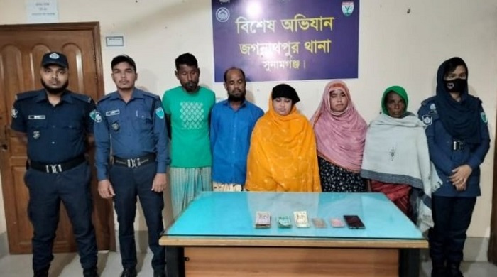 গ্রেপ্তাররা হলেন- জগন্নাথপুর পৌরসভার ইসহাকপুর এলাকার মকতুল মিয়ার মেয়ে সমলা বেগম (৪০), মৃত আমির উদ্দিনের স্ত্রীর নেছাফুল বেগম (৬০), কেশবপুর এলাকার মৃত ময়না মিয়ার ছেলে রাজু মিয়া (৫০), নেত্রকোনার মোহনগঞ্জ উপজেলার ফেরীরচর গ্রামের মৃত রহিম উদ্দিনের ছেলে আবুল মিয়া (৫০) ও কিশোরগঞ্জের মিঠামইন উপজেলার ডোহাজোড়া গ্রামের বাক্কার মিয়ার স্ত্রী আনারকলি (৩০)।