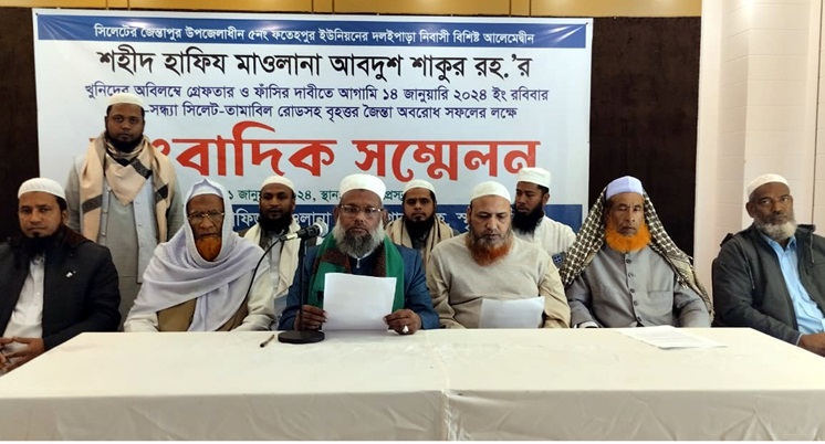 সংবাদ সম্মেলনে তিনি জানান, মাওলানা আব্দুশ শাকুর ফতেহপুর ইউনিয়নের দলইপাড়া বাসিন্দা এবং শাহপরান উপশহরস্থ জামিয়াতুল উলূমিল ইসলামিয়া সিলেটের মুহাদ্দিস। তিনি সৌদি আরবের মক্কা মুকাররামার পার্শ্ববর্তী বিবান মসজিদে দীর্ঘ ২৭ বছর ইমামতি করেছেন। গত ২৪ নভেম্বর শুক্রবার স্থানীয় হাজির আলী, নজরুল, বদরুল গংদের হাতে তিনি শহিদ হন।’ এ ঘটনায় আব্দুশ শাকুরের স্ত্রী বাদী হয়ে পরদিন জৈন্তাপুর মডেল থানায় একটি হ ত্যা মামলা দায়ের করলেও (মামলা নম্বর হলো- জে. আর ২৬৯/২৩) আসামিদের বেশিরভাগই এখনও অধরা।