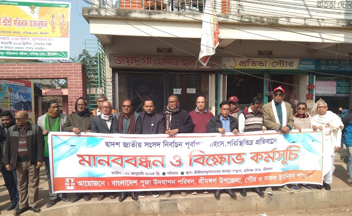 শনিবার (২০ জানুয়ারি) বেলা ১২ টা ৩০ মিনিটের দিকে শহরের হবিগঞ্জ রোডস্থ শ্রীশ্রী জগন্নাথদেবের আখড়া সম্মুখে বাংলাদেশ পূজা উদযাপন পরিষদ শ্রীমঙ্গল উপজেলা শাখার আয়োজনে উক্ত মানববন্ধন কর্মসূচি পালন করা হয়।