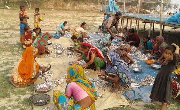 বানিয়াচং উপজেলার ১০নং সুবিদপুর ইউনিয়নের ভাটিপাড়া এলাকায় শুটকি শুকাতে ব্যস্ত জেলে পরিবারের সদস্যরা।