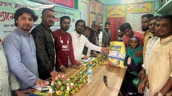 সোমবার (১১ মার্চ) বিকালে ফ্রেন্ডস ক্লাবের কার্যালয়ে ফ্রেন্ডস ক্লাবের পক্ষ থেকে মাহে রমজান উপলক্ষে ফ্যামেলি ফুড প্যাক বিতরণ অনুষ্ঠান প্রদানের পূর্বে আলোচনা সভায় সভাপতি মো. কাসেম আলী তালুকদারের সভাপতিত্বে ও সাধারণ সম্পাদক সালেহ আহমেদ মুন্নার পরিচালনায় সভার শুরুতে কোরআন তেলাওয়াত করেন সহ-সাধারণ সম্পাদক মো. রইছ উদ্দিন, স্বাগত বক্তব্য দেন প্রতিষ্ঠাতা সদস্য ও সাবেক সভাপতি মো. ইসলাম আলী।