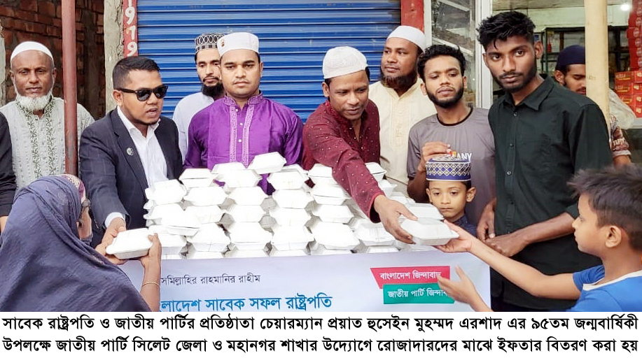 বিকালে নগরীর বিভিন্ন পয়েন্টে সাবেক রাষ্ট্রপতি জাতীয় পার্টির প্রতিষ্ঠাতা চেয়ারম্যান মরহুম হোসাইন মোহাম্মদ এরশাদের জন্মবার্ষিকী উপলক্ষে অসহায় মানুষের মধ্যে ইফতার বিতরণ করা হয়। ইফতার বিতরণ শেষে এক আলোচনা সভা অনুষ্ঠিত হয়।