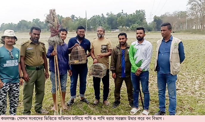 মৌলভীবাজারের কমলগঞ্জে অভিযান চালিয়ে পাখি ও পাখি ধরার সরঞ্জাম উদ্ধার করা হয়েছে। এই পাখিগুলোকে কাজে লাগিয়ে অন্য পাখিদের ধরে বাজারে বিক্রি করতেন পাখিশিকারি।