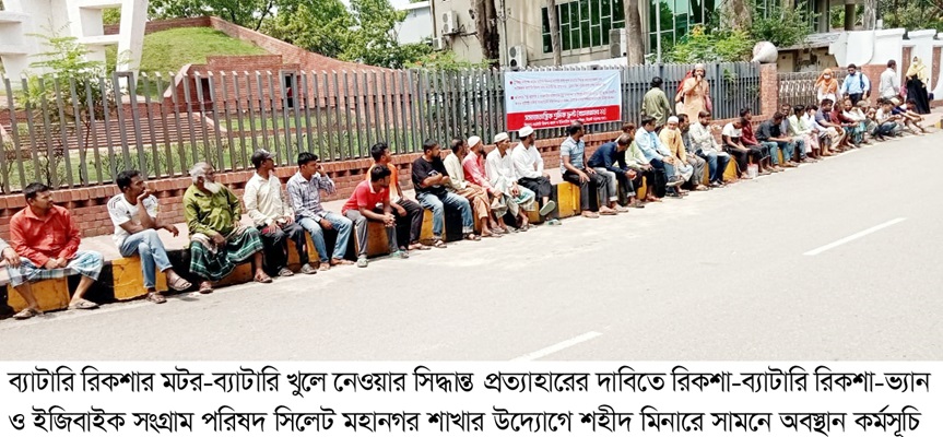 সিলেট মহানগর ট্রাফিক কর্তৃপক্ষ কর্তৃক ব্যাটারি রিকশা থেকে ব্যাটারি-মটর খুলে নেওয়ার সিদ্ধান্ত প্রত্যাহার এবং আটককৃত ব্যাটারি রিকশা মটর-ব্যাটারিসহ ছেড়ে দেওয়ার দাবিতে ৩ এপ্রিল বুধবার সিলেট কেন্দ্রীয় শহীদ মিনারের সামনে সকাল সাড়ে ১১টা থেকে দুপুর ১টা পর্যন্ত অবস্থান কর্মসূচি পালিত হয়।