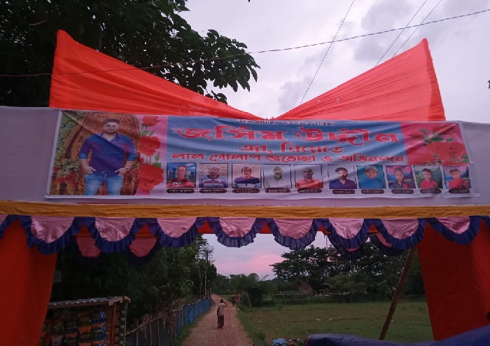 ঢাকঢোল পিটিয়ে বিয়ের আয়োজন চলছে। বিয়েতে বরকে শুভেচ্ছা জানিয়ে নির্মাণ করা হয়েছে বিশাল তোরণ। সোমবার দুপুরে বিশাল বহর নিয়ে বিয়ে করতে কনের বাড়ি গেছেন বর। তার আগে রোববার রাতে তার নিজ বাড়িতে হয়েছে গায়ে হলুদের অনুষ্ঠান।