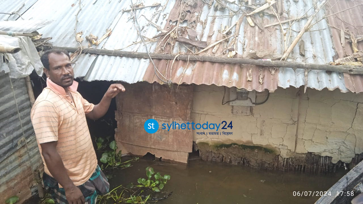প্রায় ২০ দিন ধরে আপ্তাব উদ্দিনের পরিবার আশ্রয়কেন্দ্রে আছে। ঘরে এখনও ফেরার উপায় নেই। বাড়ির চারদিকে বন্যার পানি। ঢেউয়ে চারপাশের মাটি সরে গেছে। কোনোমতে দাঁড়িয়ে আছে ঘরটি। শনিবার বিকেলে আপ্তাবকে পাওয়া যায় ঘরের সামনে। তার গ্রাম মুর্শিবাদকুরা পড়েছে বড়লেখা উপজেলার তালিমপুর ইউনিয়নে। এই ইউনিয়নের অনেক গ্রামই হাকালুকি হাওরপাড়ে। বন্যার পানি না নামায় তাদের দুর্ভোগের শেষ নেই।