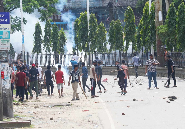 সংঘর্ষের সূত্রপাত নিয়ে প্রত্যক্ষদর্শী একাধিক ব্যক্তি জানিয়েছেন, বেলা সোয়া ১টার দিকে শিক্ষার্থীদের সড়ক থেকে সরে যেতে বলে পুলিশ। এসময় পুলিশের সাথে শিক্ষার্থীদের উত্তপ্ত বাক্যবিনিময় হয়। বাক্য বিনিময় চলাকালে শিক্ষার্থীরা পুলিশকে লক্ষ্য করে ঢিল ছুঁড়তে হয়। এসময় পুলিশও পাল্টা আক্রমন চালায়। তারা টিয়ার গ্যাস, সাউন্ড গ্রেনেড ও ফাঁকা গুলি ছুঁড়ে শিক্ষার্থীদের ছত্রভঙ্গ করে দেয়। সড়ক থেকে ছত্রভঙ্গ হয়ে শিক্ষার্থীরা আশপাশের বিভিন্ন গলিতে আশ্রয় নিতে পুলিশকে লক্ষ্য করে ইট পটেকেল নিক্ষেপ করতে থাকে। এসময় শিক্ষার্থীদের পক্ষে সংঘর্ষে বহিরাগত অনেককে অংশ নিতে দেখা যায়।