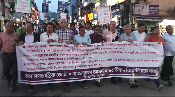 বাম গণতান্ত্রিক জোট, ফ্যাসিবাদ বিরোধী বাম মোর্চা ও বাংলাদেশ জাসদ সিলেট জেলা শাখার উদ্যোগে জনজীবনে স্বাভাবিক পরিস্থিতি ফিরিয়ে আনা, ছাত্র গণঅভ্যুত্থান হত্যাকাণ্ডের বিচার সহ অন্যান্য দাবিতে সমাবেশ ও মিছিল অনুষ্ঠিত হয়।