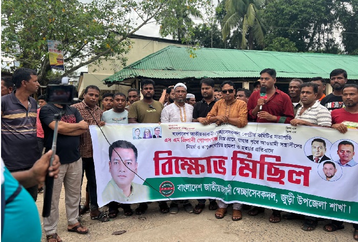 জাতীয়তাবাদী সেচ্ছাসেবক দলের সভাপতি এস ওম জিলানী গোপালগঞ্জে যাওয়ার পথে আওয়ামী লীগের নেতাকর্মী দ্বারা হামলার প্রতিবাদে ও ক্রীড়া বিষয়ক সম্পাদক শওকত আলী দিদার কে হত্যার প্রতিবাদে বিক্ষোভ মিছিল করেছে জুড়ী উপজেলা সেচ্ছাসেবক দল।