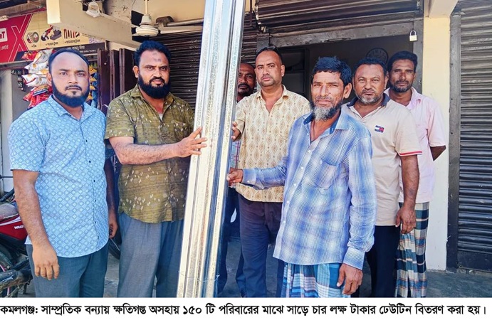 মৌলভীবাজারের কমলগঞ্জ উপজেলার ৩নং মুন্সীবাজার ইউনিয়ন পরিষদের চেয়ারম্যান প্রকৌশলী নাহিদ আহমদ তরফদারের পরিবারের সদস্য লন্ডন, আমেরিকা, প্রবাসী ভাই বোন, আত্মীয় স্বজনের পক্ষ থেকে সাম্প্রতিক বন্যায় ক্ষতিগ্রস্ত অসহায় ১৫০টি পরিবারের মাঝে সাড়ে চার লক্ষ টাকার ঢেউটিন বিতরণ করা হয়।