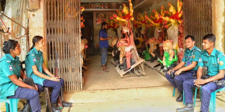 একইভাবে সিলেট নগরীর আখালিয়া ভটপাড়া, মেজরটিলা শ্যামসুন্দর আখড়ায়ও দেবী দুর্গার প্রতিমা তৈরিতে পুলিশ সদস্যদের পাহারা দিতে দেখা যায়। এই এলাকার বেশ কয়েজন বাসিন্দাও বললেন, আগে কখনো তারা প্রতিমা তৈরিতে পুলিশি পাহারা দিতে দেখেননি।
