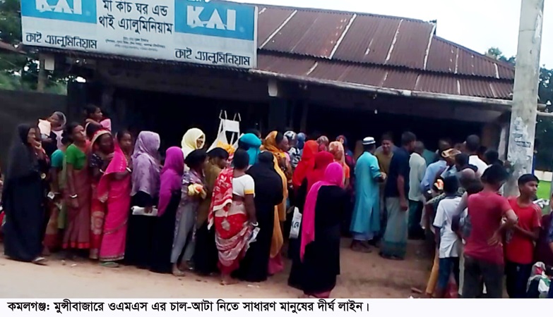 সরেজমিন গিয়ে দেখা যায়, উপজেলার মুন্সীবাজার পাম্প সিটি এলাকায় ওএমএস এর চাল-আটা নিতে আসা মানুষের দীর্ঘ লাইন।