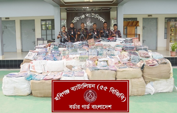 এতে আরও জানানো হয়, ৫৫ বিজিবির একটি টহল দল ঢাকা সিলেট মহাসড়কে মাধবপুর উপজেলার জগদীশপুর মুক্তিযোদ্ধা চত্তর এলাকায় গোপন সংবাদের ভিত্তিতে সোমবার সন্ধ্যায় চোরাচালান বিরোধী বিশেষ অভিযান পরিচালনা করে কাঠের গুঁড়ার বস্তা বোঝাই একটি ট্রাক আটক করে তল্লাশি চালিয়ে চার কোটি উনষাট লক্ষ পয়ত্রিশ হাজার টাকা মূল্যের সাড়ে তিন হাজার পিস ভারতীয় শাড়ি জব্দ করে।