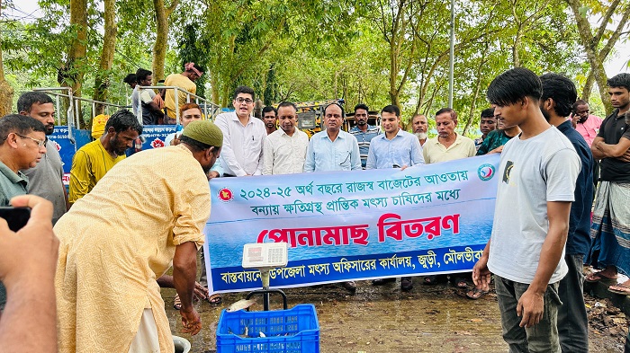 বুধবার বন্যায় ক্ষতিগ্রস্ত প্রান্তিক এসব মৎস্য চাষীদের মাঝে বিনা মূল্যে ১০ কেজি করে ৫৪ জনকে সর্বমোট ৫৪০ কেজি পোনামাছ বিতরণ করা হয়েছে।