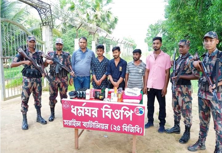 মাধবপুর উপজেলার ধর্মঘর সীমান্ত দিয়ে ভারত থেকে বাংলাদেশ অভ্যন্তরে অবৈধ অনুপ্রবেশ দায়ে ৩ ব্যক্তি সহ দুই মানব পাচারকারিকে গ্রেপ্তার করেছে ধর্মঘর সীমান্ত ফাঁড়ির বিজিবি টহলদল।