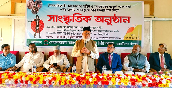 বৃহস্পতিবার দুপুর ১২ টায় উপজেলার গোয়ালাবাজার আদর্শ সরকারি মহিলা ডিগ্রি কলেজের আয়োজনে কলেজ মিলনায়তনে স্মরণ সভা ও সাংস্কৃতিক অনুষ্ঠানে প্রধান অতিথির বক্তব্য রাখেন রোটারির সাবেক গভর্নর ও সিলেট মদন মোহন সরকারি কলেজের সাবেক প্রিন্সিপাল লে. কর্নেল (অবঃ) এম আতাউর রহমান পীর।