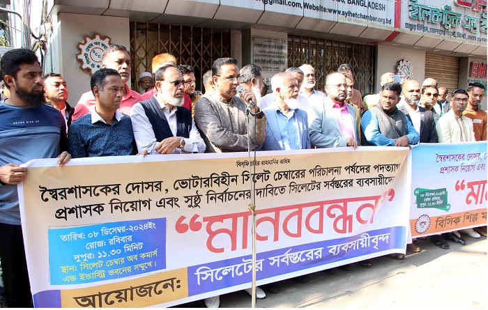 সিলেট চেম্বার অব কমার্স এন্ড ইন্ডাস্ট্রিজের ২০২৪-২৫ সালের অনির্বাচিত ও অবৈধ পরিচালনা কমিটি বিলুপ্ত করে নির্বাচিত কমিটির কাছে ক্ষমতা হস্তান্তর করতে ৪ দিনের আল্টিমেটাম প্রদান করেছেন সিলেটের সর্বস্তরের ব্যবসায়ীরা। তারা অবিলম্বে দায়িত্বরতদের পদত্যাগ করে সিলেট চেম্বারে প্রশাসক নিয়োগ করে গণতান্ত্রিক প্রক্রিয়ায় একটি বৈধ ও সুষ্ঠু নির্বাচন আয়োজনের মাধ্যমে সিলেটের আপামর ব্যবসায়ীদের প্রাণের দাবি বাস্তবায়নের আহবান জানান। অন্যথায় আগামী বৃহস্পতিবার সিলেটের সর্বস্তরের ব্যবসায়ীরা কঠোর কর্মসূচি ঘোষণার হুশিয়ারি প্রদান করেন।