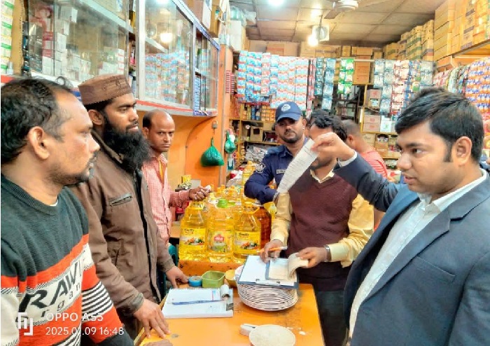 অভিযানে হাবিব ভেরাইটিজ স্টোরে দোকানের সামনে গ্যাসের সিলিন্ডার রাখায় ও খেজুরের গুড়ে মোড়ক না থাকায় ১০ হাজার এবং মা সবজি দোকানিকে বেশি দামে সবজি বিক্রি করায় এক হাজার টাকা জরিমানা করা হয়।