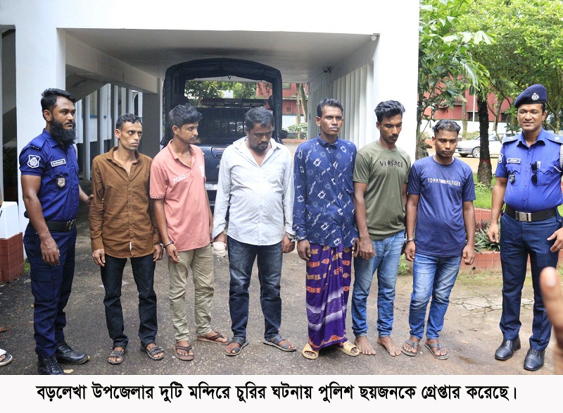 মৌলভীবাজারের বড়লেখা উপজেলার পৃথক দুটি মন্দিরে চুরির ঘটনায় পুলিশ ছয়জনকে গ্রেপ্তার করেছে। উদ্ধার করা হয়েছে চুরি যাওয়া বিভিন্ন মূল্যবান মালামাল ও চুরি কাজে ব্যবহৃত সরঞ্জাম। শুক্রবার রাতে পৃথকস্থানে অভিযান চালিয়ে তাদের গ্রেপ্তার করা হয়।