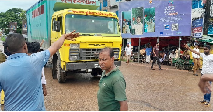 ধর্মঘট চলাকালে একটি ট্রাক আটকে দিচ্ছেন পরিবহন শ্রমিকরা।