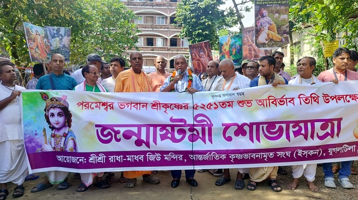 শ্রীকৃষ্ণের আবির্ভাব তিথি জন্মাষ্টমী উপলক্ষে শনিবার (১৬ আগস্ট) সকালে সিলেটে অনুষ্ঠিত হলো বর্ণাঢ্য শোভাযাত্রা। ইসকন মন্দির থেকে শুরু হওয়া এই শোভাযাত্রায় হাজারো নারী-পুরুষ ভক্তদের ঢল নামে। শহরের প্রধান প্রধান সড়ক প্রদক্ষিণ করে শোভাযাত্রাটি এক অনন্য আধ্যাত্মিক ও উৎসবমুখর পরিবেশ সৃষ্টি করে।