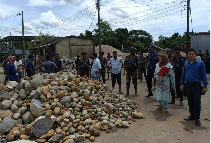 এর আগে শনিবার সকালে উপজেলার বিভিন্ন এলাকায় অভিযান চালায় টাস্কফোর্স। অভিযান চলাকালে ৪নং বাংলাবাজার এলাকায় কয়েকটি ক্রাশার মিলে রাংপানি নদীর দুই হাজার ঘনফুট ও শ্রীপুর চা বাগানের পাশে মজুত করে রাখা আরও ১২ হাজার ঘনফুট পাথর জব্দ করা হয়।