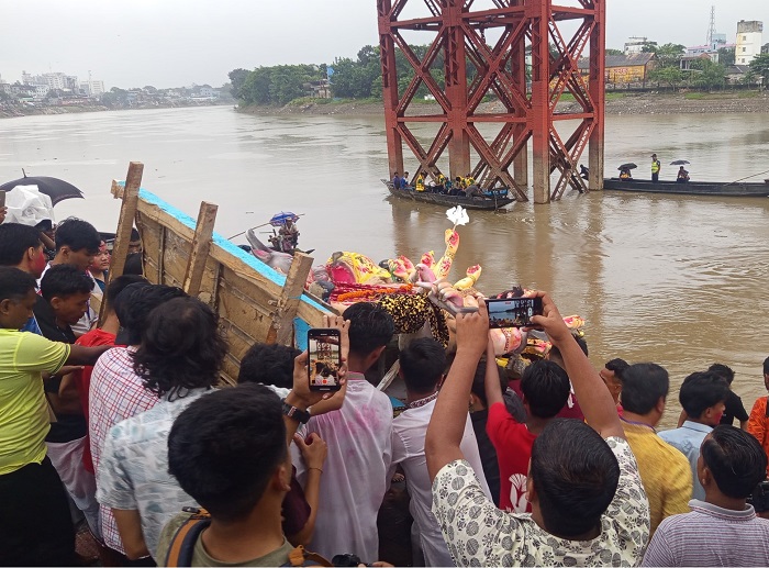 পাঁচ দিনব্যাপী এ দুর্গোৎসব উদযাপন শেষে বৃহস্পতিবার (০২ অক্টোবর) বিকাল থেকে সিলেটের চাঁদনী-ঘাটে প্রতিমা বিসর্জন শুরু হয়। সনাতন ধর্মাবলম্বীদের মতে এবার দেবী দুর্গার আগমন ঘটে গজে অর্থাৎ হাতির পিঠে চড়ে। গজে আগমন বা গমন হলে পৃথিবী শস্য-শ্যামলা হয়। আর দশমীতে দেবীর প্রস্থান ঘটেছে দোলায় চড়ে।