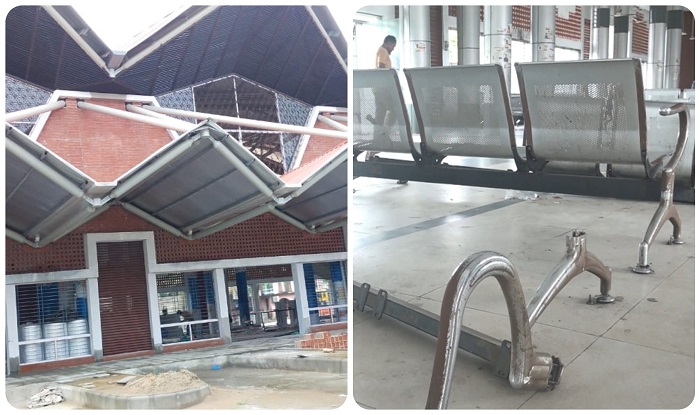 যাত্রীদের বসার জন্য রাখা চেয়ারগুলো অর্ধেকই ভেঙে গেছে। কোনটা আবার চুরি হয়ে গেছে। খসে পড়েছে লাইট-সিলিং ফ্যান। বাথরুমের অবস্থা তো যাচ্ছেতাই। দেওয়ালেরও পলেস্তারা খসে পড়তে শুরু করেছে।