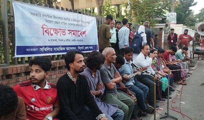 অবিলম্বে নিয়োগ প্রক্রিয়া পুনরায় চালু করে সংগীত ও শারীরিক শিক্ষক নিয়োগের জোর দাবি জানান বক্তারা।