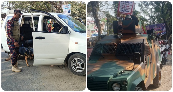 সড়কের পাশে লাইন ধরে দাঁড় করানো রয়েছে সাজোয় যান। যানগুলোর সামনে দাঁড়িয়ে আছেন বর্ডার গার্ড বাংলাদেশ- বিজিবির সদস্যরা। তার পাশেই ডগ স্কোয়াডের কুকুরদের নিয়ে দাঁড়িয়ে আছেন আরও কয়েকজন বিজিবি সদস্য। হাতে অস্ত্রশস্ত্র নিয়ে এদিক ওদিক দৌড়াদৌড়ি করছেন আরও কয়েকজন। সাইরেন বাজিয়ে ছুটে চলছে বিজিবির গাড়ি।