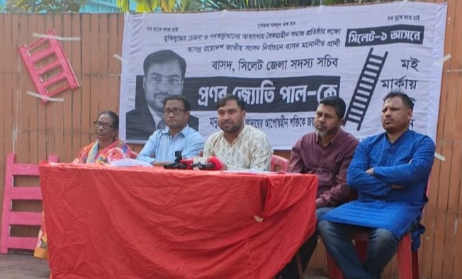 সিলেট-১ আসনে বাসদ মনোনীত মই মার্কার সংসদ সদস্য পদপ্রার্থী প্রণব জ্যোতি পাল (৮ ফেব্রুয়ারি) রোববার বিকাল ৩টায় সিলেট কেন্দ্রীয় শহীদ মিনারে নির্বাচনী ইস্তেহার পাঠ করেছেন।