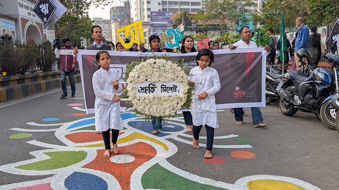 শনিবার (২১ ফেব্রুয়ারি) ২০২৬ সকালে নগ্ন পায়ে একুশের সুরে বর্ণমালার মিছিল শুরু হয়। সবার হাতে হাতে ছিল বর্ণমালা আর কণ্ঠে ছিলো একুশের গান। সূর্যোদয়ের পরপরই গৌরবের বাংলা বর্ণমালা হতে নিয়ে খালি পায়ে বিভিন্ন সড়ক প্রদক্ষিণ করে নতুন প্রজন্মের প্রতিনিধিরা শ্রদ্ধার্ঘ্য প্রদান করে শহীদ বেদীতে।