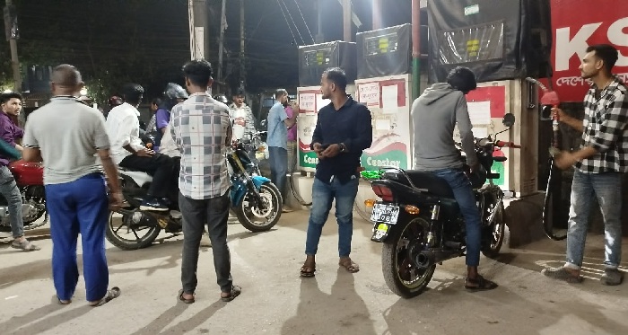 বৃহস্পতিবার রাত ১০টায় নগরীর পাঠানটুলার একটি পেট্রল পাম্পে দেখা যায়, মোটর াইকেলের দীর্ঘ লাইন। লাইন ধরে জ্বালানী লে সংগ্রহ করছেন চালকরা। তারা একজন আরেকজনকে বলছেন "একটু বেশি করে তেল নেইন ভাই তেলের দাম বাড়ি যার।"