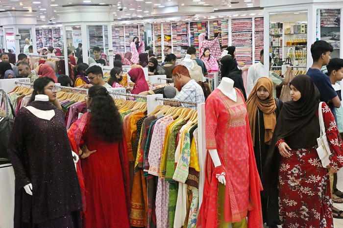 সকাল থেকে মধ্যরাত পর্যন্ত ক্রেতাদের ভিড় লেগে আছে নগরীর নয়াসড়কে অবস্থিত 'মাহা' ফ্যাশন হাউজে।