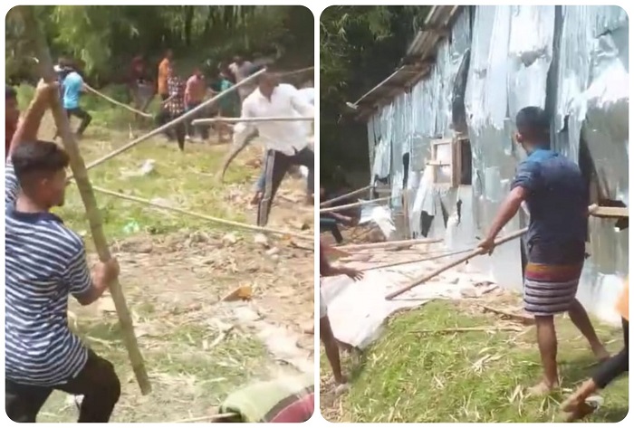 ভিডিওতে দেখা যায়, একটি টিনের চালা ও বেড়ার ঘরের সামনে মধ্যবয়সী এক নারী দুই বছরের এক শিশুসন্তানকে কোলে নিয়ে হামলা না করার অনুরোধ করছেন লোকজনকে। তাঁর আরেক হাতে ছিল রামদা। কিন্তু লোকজন ওই নারীর কথায় কান না দিয়ে তাঁদের ওপর মুহুর্মুহু ঢিল ছুড়ছেন। একপর্যায়ে ওই নারী কোল থেকে শিশুটিকে রেখে রামদা হাতে মানুষের দিকে তেড়ে যান। পরে আরেক লোক এসে ওই নারী ও শিশুকে সরিয়ে দেন। এরপর মুহূর্তেই ঘরটি ভেঙে শেষ করে দেন লোকজন। এভাবে দুটি ঘরে হামলা ও ভাঙচুর করা হয়।