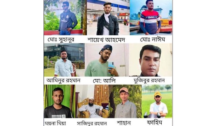 দিরাই উপজেলার আছেন চারজন। তারা হলেন, উপজেলার তারাপাশা গ্রামের আবু সর্দারের ছেলে মো. নুরুজ্জামান সর্দার ময়না (৩০), একই গ্রামের মৃত ক্বারী ইসলাম উদ্দীনের ছেলে মো. সাহান ( ২৫ ), আব্দুল গণির ছেলে মো. সাজিদুর রহমান (২৮), উপজেলার রনারচর গ্রামের মুজিবুর রহমান (৪০)। এছাড়া দোয়ারাবাজার উপজেলার আরেকজন মারা গেছেণ। তিনি কবিরনগর গ্রামের ফয়েজ উদ্দিনের ছেলে ফাহিম আহমেদ মুন্না (২০) । এছাড়া, দিরাই উপজেলার করিমপুর ইউনিয়নের তারেক (২২) নামের আরো একজন এখনো নিখোঁজ রয়েছেন।