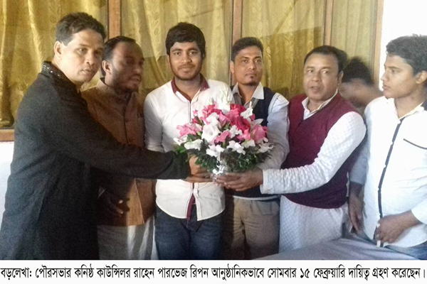 মৌলভীবাজারের বড়লেখা পৌরসভার কনিষ্ঠ কাউন্সিলর রাহেন পারভেজ রিপন আনুষ্ঠানিকভাবে সোমবার (১৫ ফেব্রুয়ারি) দায়িত্ব গ্রহণ করেছেন। দায়িত্ব গ্রহণ অনুষ্ঠানে সভাপতিত্ব করেন পৌর মেয়র আবুল ইমাম মো. কামরান চৌধুরী।