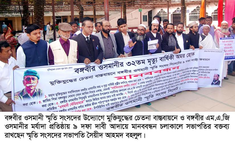 মুক্তিযোদ্ধের সর্বাধিনায়ক বঙ্গবীর এম.এ.জি ওসমানীর ৩২তম মৃত্যুবার্ষিকী উপলক্ষে ১৬ ফেব্রুয়ারী সোমবার বঙ্গবীর ওসমানী স্মৃতি সংসদের উদ্যোগে বিভিন্ন কর্মসূচি পালন করা হয়।