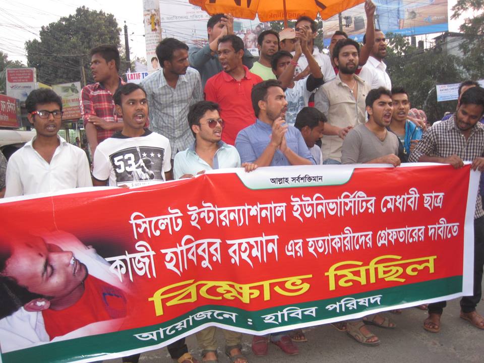 সিলেট ইন্টারন্যাশনাল ইউনিসির্টির বিবিএ ৪র্থ বর্ষের ছাত্র কাজী হাবিব হত্যাকারীদের দ্রুত গ্রেফতার ও বিচারের দাবিতে সিলেট নগরীতে বিক্ষোভ মিছিল করেছে কাজী হাবিব পরিষদ সিলেট।
