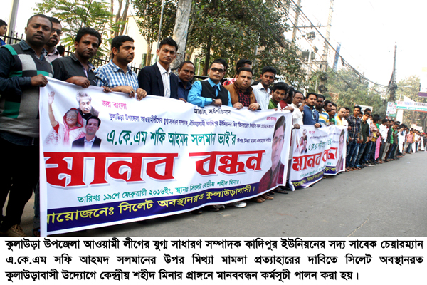 কুলাউড়া উপজেলা আওয়ামী লীগের যুগ্ম সাধারণ সম্পাদক কাদিপুর ইউনিয়নের সদ্য সাবেক চেয়ারম্যান এ.কে.এম সফি আহমদ সলমানের উপর মামলা প্রত্যাহারের দাবিতে ‘সিলেট অবস্থানরত কুলাউড়াবাসী’ ব্যানারে শুক্রবার সিলেট কেন্দ্রীয় শহীদ মিনার প্রাঙ্গনে এক মানববন্ধন কর্মসূচী পালন করা হয়।