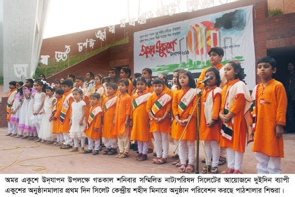 শনিবার অনুষ্ঠানের শুরুতেই ভাষা আন্দোলনে শহীদদের স্মরণে দাঁড়িয়ে এক মিনিট নীরবতা পালন করা হয়। সম্মিলিত নাট্য পরিষদ সিলেটের সহ-সভাপতি খোয়াজ রহিম সবুজ ও সাধারণ সম্পাদক রজতকান্তি গুপ্তের পরিচালনায় অনুষ্ঠানে অংশ নেন বাংলাদেশ উদীচী শিল্পী গোষ্ঠী সিলেট জেলা সংসদ, নজরুল একাডেমী সিলেট, থিয়েটার সিলেট, মৃত্তিকায় মহাকাল, পাঠশালা, মুক্তাক্ষর, নবারুন সংগীত বিদ্যালয়, ছন্দ নৃত্যালয়, সিলেট আর্ট এন্ড কালচার ইন্সটিটিউট, নাট্যম সিলেট, গ্রীন ডিজেবল ফাউন্ডেশন, অংশুমান দত্ত অঞ্জন, শান্তনু সেন তাপ্পু সহ বিভিন্ন শিল্পী ও সংগঠন।