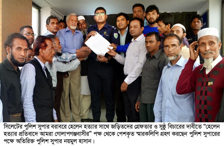 সিলেটের পুলিশ সুপার বরাবরে হেলেন হত্যার সাথে জড়িতদের গ্রেফতার ও সুষ্ঠু বিচারের দাবীতে ২৪ ফেব্রুয়ারি বুধবার সকালে পুলিশ সুপারে কার্যালয়ে “হেলেন হত্যার প্রতিবাদে আমরা গোলাপগঞ্জবাসীর” পক্ষ থেকে স্মারকলিপি প্রদান করা হয়।