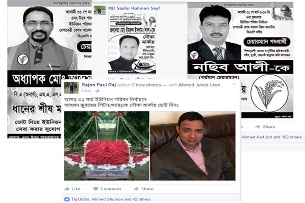 সামাজিক যোগাযোগ মাধ্যম ফেসবুক ঘেঁটে দেখা গেছে, দশ ইউনিয়নের চেয়ারম্যান প্রার্থী ও তাদের সমর্থকদের দম ফেলার সুযোগ নেই। চলছে তুমুল প্রচার-প্রচারণা। নির্বাচনকে সামনে রেখে পাল্লা দিয়ে চলছে ফেসবুকে সকল প্রার্থীর প্রতীকসহ ভোট চাওয়ার হিড়িক। যদিও নির্বাচন কমিশনের তফসিল অনুয়ায়ি প্রতীক বরাদ্দ হবে ১৪ মার্চ।