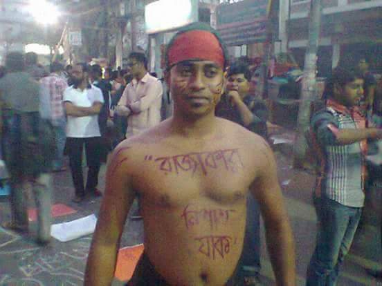 বুধবার রাতে খুন হওয়া অনলাইন এক্টিভিস্ট নাজিমুদ্দিন সামাদের একটি ছবি ফেসবুকে ভাইরাল হয়ে গেছে। ছবিতে উদোম গায়ে সামাদের বুকে লাল হরফে লেখা রয়েছে- ‘রাজাকার নিপাত যাক’।