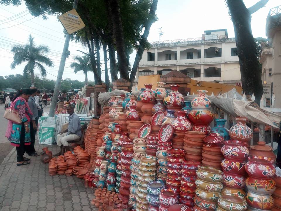 পাশের দোকানী অমূল্য নাথ অনেকদিন ধরেই সারদা হলের দেয়াল ঘেসে মাটির তৈরি হাড়ি পাতিল বিক্রি করেন। তিনি জানান, এবারের বৈশাখের বেছাকেনা এখনো শুরু হয়নি। তবে এক - দুইদিনের মধেই বেচা বিক্রি শুরু হবে বলে আশা তার।