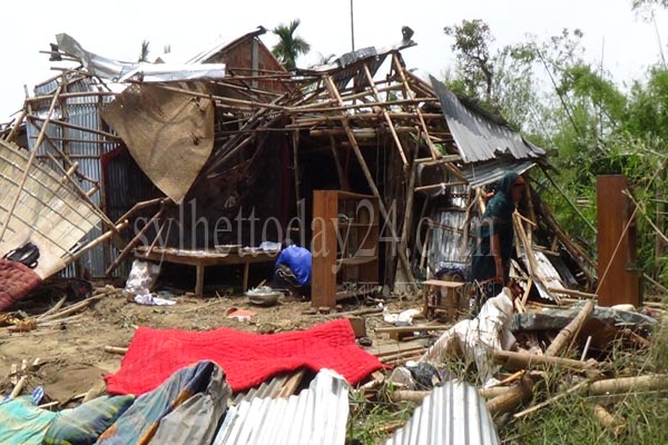 এদিকে সরেজমিন গিয়ে দেখাযায়, ঘর বাড়ি হারিয়ে হাজারো মানুষ খোলা আকাশের নিচে মানবেতর জীবনযাপন করছে। বিভিন্ন স্থানে ছড়িয়ে ছিটিয়ে পড়ে আছে আসবাবপত্র। গাছে গাছে ঝুলে আছে চালের টিন। মানুষের পাশাপাশি ক্ষতি হয়েছে ফসল ও গবাদি পশুর। বিস্তীর্ণ হাওরে ছড়িয়ে ছিটিয় পড়ে আছে বই, খাতা, কাপড় সহ বিভিন্ন জিনিসপত্র। ছাতক সুনামগঞ্জ সড়কে ভেঙ্গে পড়েছে অসংখ্য গাছ বন্ধ হয়ে যায় এ সড়ক। শুক্রবার সকাল থেকে ছাতক ও সুনামগঞ্জ ফায়ার সার্ভিসের রেসকিউ টিম এসব গাছ সরিয়ে বিকেল নাগাদ সড়ক যোগাযোগ স্বাভাবিক করে।