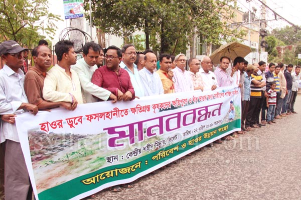 বাঁধ ভেঙ্গে হাওরে ফসলহানিতে ক্ষতিগ্রস্ত কৃষকদের ক্ষতিপুরণ প্রদানের দাবিতে নগরীতে মানববন্ধন করেছে পরিবেশ ও হাওর উন্নয়ন সংস্থা। শুক্রবার বিকেলে সিলেট কেন্দ্রীয় শহীদ মিনারের সামনে এ মানববন্ধন কর্মসূচী পালণ করে।