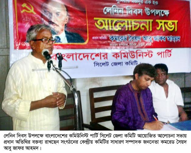 লেনিন দিবস উপলক্ষে আয়োজিত আলোচনা সভায় প্রধান অতিথির বক্তব্যে বাংলাদেশের কমিউনিস্ট পার্টি (সিপিবি)র কেন্দ্রীয় কমিটির সাধারণ সম্পাদক কমরেড সৈয়দ আবু জাফর আহমদ বলেন, মহান নেতা লেনিন এর দেখিয়ে যাওয়া পথে আমাদের একটি শোষণহীন ও অসম্প্রদায়িক সমাজ ও রাষ্ট্র গঠনের সংগ্রামে নিয়োজিত হতে হবে।