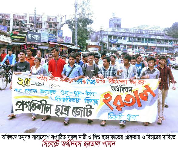 তনু হত্যাসহ অব্যাহত গুম-খুন-ধর্ষণঅবিলম্বে তনুসহ সারা দেশে সংগঠিত সকল নারী ও শিশু হত্যাকান্ডের ঘটনার সাথে জড়িতদের অবিলম্বে গ্রেফতার ও বিচারের দাবিতে অর্ধদিবস হরতাল পালন করে প্রগতিশীল ছাত্র জোট ।